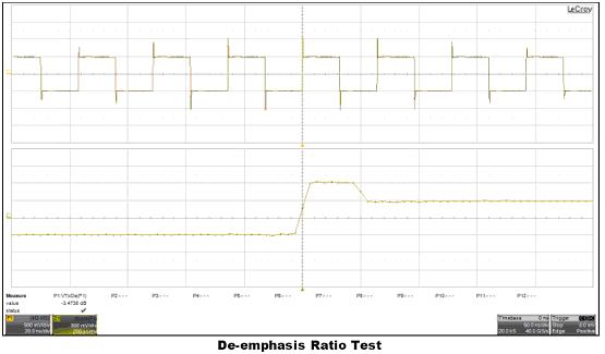 為了把5Gbps速率的數據傳送較遠的距離,USB3.0的發送端使用了去加重技術,這項測試可以測量DUT的去加重程度是否滿足規范要求(要求在-3dB到-4dB之間)。測試時DUT發送出CP7碼流,CP7碼型由50-250個連續的1和50-250個連續的0重復交替組成,而且是添加了去加重的信號波形。圖3為某USB3.0芯片的去加重測量結果,該芯片采用了-3.47dB的去加重。