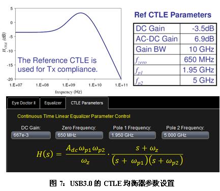 USB的官方組織規定了USB3.0使用的CTLE均衡器的參數,如下圖7左上部分為均衡器的頻響,右上方的表格是均衡器的參數,下方是力科示波器中集成了USB3.0的均衡器參數,可方便調用。