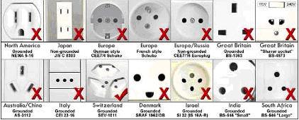 這些插頭/座大多彼此互不兼容,如果再把同一類型中耐壓、功率的差別計(jì)入在內(nèi),種類就更多了。這種情況顯然造成:即使電器設(shè)備供電電壓相同,也無法在不同地區(qū)使用。國際電工委員會(huì)(IEC)曾經(jīng)在1986年和1992年頒布了電源插頭/座的國際標(biāo)準(zhǔn):針對(duì)250V電壓等級(jí)的IEC60906-1和針對(duì)125V電壓等級(jí)的IEC60906-2。其3芯插頭外觀(圖2.1)類似于表2.1中的J型,由于與全球范圍內(nèi)大多數(shù)插頭/座不兼容(圖2.2),推行受到很大阻力。