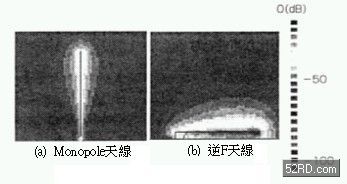 由上式可知如果縮任意小天線大小的話,Pr會比Pd小導(dǎo)致放射效率大幅降低,這種現(xiàn)象尤其是天線附近的電磁界更加明顯。圖2是提供相同電力給兩種天線時(shí),天線附近的實(shí)際電界分布狀態(tài),圖中的單極(Monopole)天線高度為λ/4(此處λ表示天線頻率的對應(yīng)波長)屬于中等大小天線,此時(shí)單極天線最大強(qiáng)度大約是-20dB。