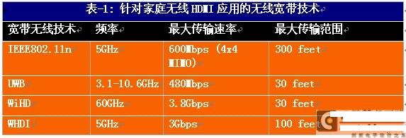 目前,有如表-1中所列幾種針對(duì)高清顯示器和投影儀的寬帶無線技術(shù)。