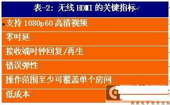 無線HDMI的目標(biāo)是提供與有線HDMI相同的用戶體驗(yàn)。由此我們?cè)诒?2中列出無線HDMI的幾項(xiàng)關(guān)鍵指標(biāo):