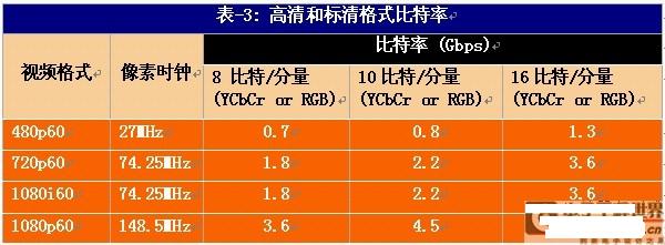 表-3列出了通過有線HDMI傳輸各種高清和標(biāo)清視頻格式所需要的帶寬。