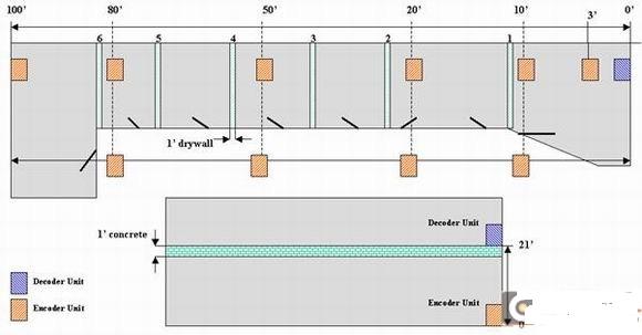 相對(duì)于可視距離的無線通信的應(yīng)用,802.11n可實(shí)現(xiàn)更遠(yuǎn)距離的(非可視距離)的多媒體通信,比如在家里的不同房間之間的音視頻通過無線播放。我們用標(biāo)準(zhǔn)的802.11的產(chǎn)品用來測(cè)試,證明魯棒性很好,可以穿越墻壁和混凝土樓板,圖-1是測(cè)試環(huán)境圖示,用SONY的PS3游戲機(jī)作為高清的視頻源,源和顯示設(shè)備之間距離100英尺并穿越6面墻,視頻的內(nèi)容包括游戲和電影視頻。表5是測(cè)試結(jié)果,一組是編碼端和解碼端都是2x3MIMO(2個(gè)發(fā)送天線和3個(gè)接收天線)的無線設(shè)備,另一組采用編碼端2x3MIMO,接收端2x2MIMO的無線設(shè)備。WW602編碼用20Mbps碼流的圖像質(zhì)量可超越高清電纜傳輸?shù)?-15Mbps的圖像質(zhì)量。