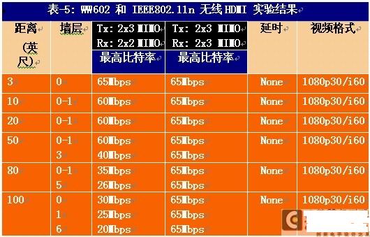 最新的超低時(shí)延H.264高清視頻編解碼芯片WW602和WW108支持信道自適應(yīng)傳輸速率,可變速率和可變分辨率.這些先進(jìn)的特性使得無線HDMI可以實(shí)時(shí)調(diào)整碼率以匹配各種不同工況下的信道帶寬,也可以將高清內(nèi)容變換以適應(yīng)那些僅能處理較低分辯率和較低碼率的設(shè)備.見表-5.