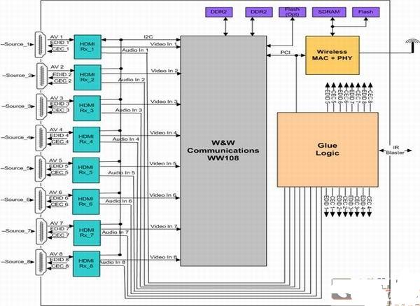 圖-2展示了基于WW602的單碼流無線HDMI方案的框圖。圖-3展示了基于WW108的多碼流無線媒體集線器方案的框圖.在這些方案中,只有視頻經(jīng)過壓縮和解壓,而音頻和控制信號(hào),如HDMICEC和EDID,都是通過無線信道直傳的。