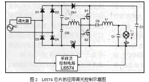 L6574芯片是意法半導體公司的高性能鎮流器驅動器,被設計為離線式600V雙極-互補金屬氧化半導體,是電子節能燈鎮流器半橋型轉換器。為了更好地調光,除了加入PFC電路之外,還加入了L6574芯片的采樣及控制電路,圖2為L6574芯片的應用調光控制示意圖。