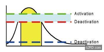 電容式感測器利用基線值和一連串的臨界值來決定感測器的觸發狀態。觸發區域的上下限能對感測器的觸發產生遲滯作用。要觸發感測器就必須要超越較高的臨界值,而且被觸發的狀態會一直持續到計數值降到較低的臨界值以下為止,如(圖四)。