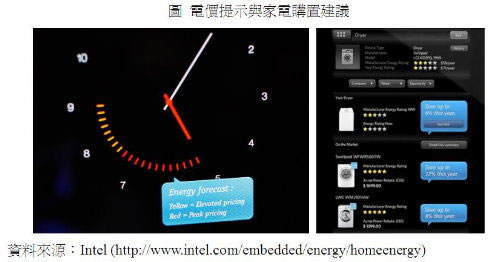 如同前述的家庭能源管理項目,Intel儀表板透過ZigBee無線技術連結家中的各項家電,監控用電狀況。此外,透過WiFi連結家中寬頻網路,可與當地的電力公司進行資訊傳遞或更新(或透過Zigbee技術與智慧電表連結,進一步與電力公司連線)。而透過儀表板上顯示的差異電價時段或市面上各項家電的耗能(節費)資訊,儀表板可以提供使用者用電與家電購置的建議,甚至可協助計算需使用多久的時間才能回本。
