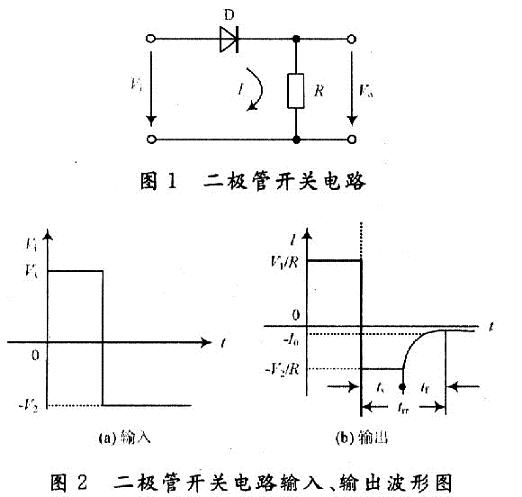 [page]如圖1所示,輸入端施加一脈沖信號Vi,其幅值為+V1和-V2。當(dāng)加在二極管兩端的電壓為+V1,二極管導(dǎo)通;當(dāng)加在二極管兩端的電壓為-V2,二極管截止,輸入、輸出波形如圖2所示。二極管兩端的電壓由正向偏置+V1變?yōu)榉聪蚱?V2時(shí),二極管并不瞬時(shí)截止,而是維持一段時(shí)間ts后,電流才開始減小,再經(jīng)tf后,反向電流才等于靜態(tài)特性上的反向漂移電流I0,其值很小。ts稱為存貯時(shí)間,tf稱為下降時(shí)間,ts+tf=trr稱為關(guān)斷時(shí)間。二極管兩端的電壓由反向偏置-V2變?yōu)檎蚱?V1時(shí),二極管也不是瞬時(shí)導(dǎo)通,而是經(jīng)過導(dǎo)通延遲時(shí)間和上升時(shí)間后才穩(wěn)定導(dǎo)通,這段時(shí)間稱為開通時(shí)間。顯然二極管的導(dǎo)通和截止時(shí)刻總是滯后加于其兩端高、低電平的時(shí)刻。二極管從截止轉(zhuǎn)為正向?qū)ǖ拈_通時(shí)間,與從導(dǎo)通轉(zhuǎn)向截止時(shí)的關(guān)斷時(shí)間相比很小,其對開關(guān)速度的影響很小,在分析討論中主要考慮關(guān)斷時(shí)間的影響。