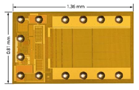 Peregrine半導體公司的設計人員已基于該公司的UltraCMOS工藝和HaRP創新設計開發出DuNE技術,并已申報專利。DuNE數字可調電容器(DTC)芯片是為滿足天線調諧要求而設計的,它內含一些高Q值電容和一個串行接口,并具有偏置電壓低和線性度高的優點。該器件采用倒裝芯片封裝,面向GSM/WCDMA手機的DuNEDTC的尺寸為1.36×0.81mm(見圖5)。