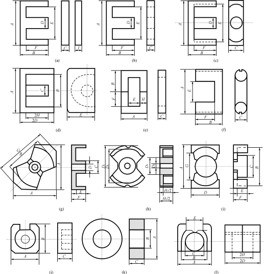 軟磁鐵氧體的鐵心結(jié)構(gòu)比較多,這是由于采用熱壓工藝,比較容易加工成各種形狀。有EI、EE、EER、EP、UF、UYF、RM、PM、PQ、Q(罐形)、T(環(huán)形)和LP形等等(圖8)。EI形以尺寸A(E形鐵心寬度)為標(biāo)志,EE形以尺寸A(E形鐵心寬度)和2×B(E形鐵心長度)為標(biāo)志,已形成EI10~50,EE8.3/8.0~110/80系列,品種多,制造工藝簡單成熟,散熱好,便于引出接線,成本較低。缺點是鐵心中間柱截面為方形,給線圈繞制帶來麻煩。同時,無屏蔽,容易產(chǎn)生雜散磁場干擾。EER形也是以尺寸A(E形鐵心寬度)和2×B(E形鐵心長度)為標(biāo)志,已形成EER25/33~54/50系列,鐵心中間柱截面為圓形,繞線比較方便,同時繞線長度比方形截面縮短11%,從而降低銅損。