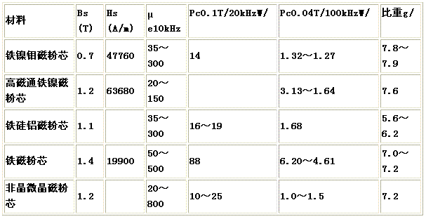 對磁粉芯提出的指標(biāo)有飽和磁通密度Bs、有效磁導(dǎo)率μe、有效品質(zhì)因數(shù)Qe、有效磁導(dǎo)率溫度系αμe及居里點、比重等。主要的磁粉芯的性能參數(shù)如表1所示。鐵鎳鉬磁粉芯國家標(biāo)準(zhǔn)型號為FN81,上海鋼鐵研究所型號為SN,美國阿諾德公司型號為MPP,磁導(dǎo)率高,工作環(huán)境適應(yīng)范圍廣,損耗低,但價格貴。鐵鎳高磁通磁粉芯國家標(biāo)準(zhǔn)型號為FN50,美國阿諾德公司型號為HF,飽和磁通密度高,磁導(dǎo)率中等,損耗也較低,價格較便宜,國內(nèi)外最近比較重視研究和使用。鐵硅鋁磁粉芯上海鋼鐵研究所型號為SA,美國阿諾德公司型號為MS,是一種價格較低,綜合性能指標(biāo)較好的磁粉芯。鐵磁粉芯上海鋼鐵研究所型號SF,國外一般型號為IP,磁導(dǎo)率和飽和磁通密度高,但在高頻下?lián)p耗大,只適用于低頻和20kHz以下的中頻使用。由于價格便宜,可以把它加工成大型磁粉芯,代替硅鋼,作為大容量直流電源的濾波電抗器。