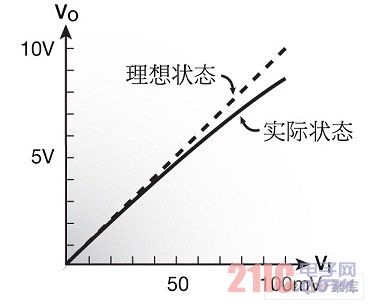 通常k>2,故R2>R1。這表明,在電阻器R2中的功耗和溫升總會超過在電阻器R1中的功耗和溫升。即使兩個電阻器均具有相同的TCR(理想情況),該放大器的增益也將變化,這是因為R2/R1比率將取決于輸出電壓VO。因而,聲音信號的典型尖峰和脈沖可能造成放大器增益的瞬態變化。其結果是輸入電壓VI和輸出電壓VO之間的非線性依賴(圖4)。這個現象稱作溫度引起的放大器的非線性。其原因是電阻器的自熱,其定量的特點是電阻功率系數(PCR)。減小電阻功率系數(PCR)的方法是選擇具有最小絕對TCR值的R1和R2電阻器。