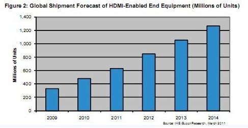 據IHS iSuppli公司的研究,液晶電視和其它高級數字設備的事實性連接標準HDMI,將被2011年出現的將近6.3億個消費電子產品采用,充當主要的設備接口,盡管在中國面臨另外一種標準的挑戰。