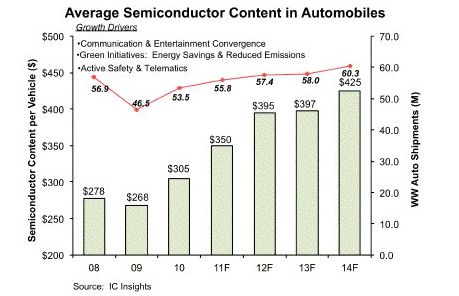 據市調公司ICInsights報道,汽車上裝備電子設備風潮的流行速度已經超過了外界原先的預期。報道指出:“過去只有豪車級別的車型才會裝備復雜的電子系統,而幾年后的今天,中低檔車型上裝備復雜電子系統已經成為一種常態了。”ICInsights公司還因此調高了其對今年汽車用IC市場走勢的預期,將平均每輛汽車上安裝的半導體設備的價值調高到了350美元,比去年的平均值305美元提升了15%幅度。