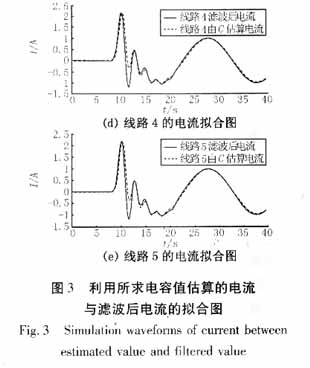 由此可得:C2+C3+C4+C5=0.75462μF,可見其數值上與C∑相等。并且,由系統參數ωC0=4.175μS/km可推出C0=4.175/314=0.013296μF,則由Ci=C0*li可得:C2=0.39888μF,C3=0.07978μF,C4=0.13296μF,C5=0.13296μF,可見,這些值和利用本方法估計出的各線路對地電容值差甚微。
