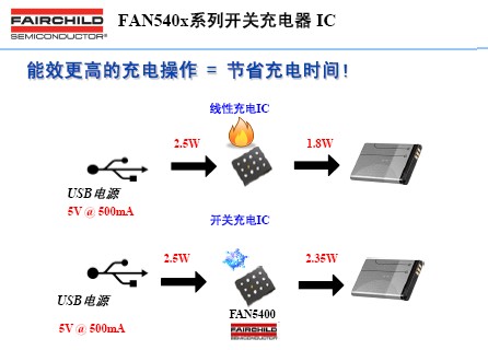 FAN5400系列電池充電器IC使用高集成度開關模式充電器,以便最大限度地縮短從USB電源為單節鋰離子(Li-Ion)電池充電的時間,并使用升壓調節器從電池為USB外設供電。由于充電電流和電池容量繼續增加,使用線性充電器通過USB端口或5V AC/DC適配器進行充電的效率變得越來越低,FAN5400的開關模式充電器能夠提供高達94%的效率,有助于加快充電速度并減少熱耗散。