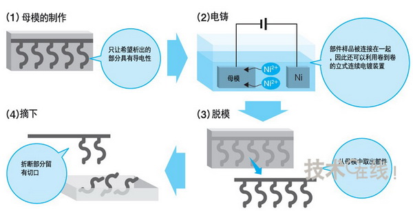 此外,電鑄在生產(chǎn)上也具有優(yōu)勢。沖壓加工需要昂貴且生產(chǎn)周期較長的模具,而電鑄則不需要。歐姆龍表示,“采用沖壓加工的話,模具制作需要一個(gè)月左右的時(shí)間。而電鑄只需約一周時(shí)間就可以進(jìn)入量產(chǎn)”。不過,由于電鑄并不是一項(xiàng)新技術(shù),因此其他公司很容易效仿。關(guān)于這一點(diǎn),歐姆龍表示“即使生產(chǎn)出試制品,也不容易進(jìn)行量產(chǎn)”。歐姆龍沒有公布具體的量產(chǎn)方式,不過根據(jù)部件樣品構(gòu)想的大致生產(chǎn)流程如圖3所示。(記者:池松 由香)