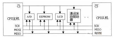 SPI(serial peripheral interface,串行外圍設備接口)總線技術是Motorola公司推出的一種同步串行接口。它用于CPU與各種外圍器件進行全雙工、同步串行通訊。它只需四條線就可以完成MCU與各種外圍器件的通訊,這四條線是:串行時鐘線(CSK)、主機輸入/從機輸出數據線(MISO)、主機輸出/從機輸入數據線(MOSI)、低電平有效從機選擇線CS。當SPI工作時,在移位寄存器中的數據逐位從輸出引腳(MOSI)輸出(高位在前),同時從輸入引腳(MISO)接收的數據逐位移到移位寄存器(高位在前)。發送一個字節后,從另一個外圍器件接收的字節數據進入移位寄存器中。即完成一個字節數據傳輸的實質是兩個器件寄存器內容的交換。主SPI的時鐘信號(SCK)使傳輸同步。其典型系統框圖如下圖所示。