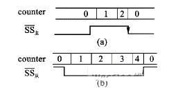 對從模式(MSTR=0),在沒有數據傳送的時候,SS高電平表示從器件未被選中,從器件不工作,MISO輸出高阻;在數據傳輸過程中,片選信號SS必須接低電平,且SS不允許跳變。如果SS從低電平跳到高電平,在SS的上跳沿,SPI模塊也將檢測到模式錯誤,清空內部計數器counter,并結束正在進行的數據傳輸。直到SS恢復為低電平,重新使SPEN=1時,才重新開始工作,如圖6(b)所示。