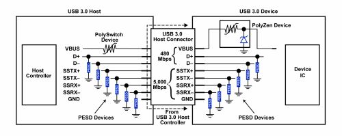 對于USB 3.0設備,PolyZen器件可安裝在USB輸入端口的VBUS上、Powered-B插頭的DPWR端口、桶形插座電源端口、以及USB集線器的VBUS輸入端。