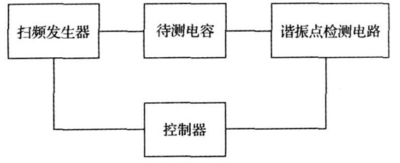 同時諧振發生時整個LC 回路表現出的阻抗為純阻性, 即感抗和容抗之和為零。利用這個原理, 使用一個掃頻信號激勵待測電容, 測量出諧振頻率, 再結合式(1) 即可測出寄生電感的大小 。根據該原理, 設計1 個掃頻發生器產生掃頻信號激勵待測電容, 然后找出諧振點, 讀出諧振頻率即可求出電容的寄生電感。其結構如圖3 所示。