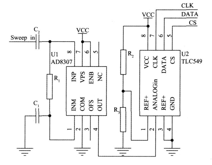 諧振點檢測電路主要由檢波器和AD 轉換器組成, 其中常用的檢波器有峰值檢波器、有效值檢波器和對數檢波器。由于這里的檢波只是為了檢測出諧振點, 因此對檢波器的種類沒有特殊要求, 這里采用AD8307 這款寬帶對數檢波器。A D8307 可以實現DC 500 MH z 頻率范圍內的對數檢波器, 其輸出為直流電壓, 輸出與輸入功率( 以dBm為單位) 呈線性關系。