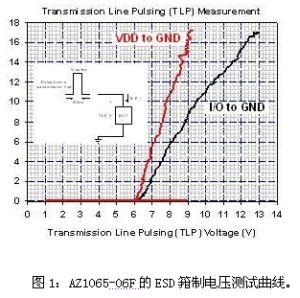最重要是,與相同的寄生電容相比,AZ1065擁有最低的ESD箝制電壓,可有效防止數據傳輸時被ESD事件干擾,這樣才能讓具有USB 3.0連接端口的電子系統得以通過Class-A的IEC 61000-4-2系統級靜電放電保護測試。利用傳輸線脈沖系統(TLP)測量AZ1065-06F后,可以觀察到如圖1所示的ESD箝制電壓特性。
