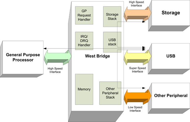 在一個普通的場景中,在device端,處理器直接連接到USB、存儲器和外設。記住這種結構,由High-Speed過渡到SuperSpeed,處理 器的影響可以概括如下: