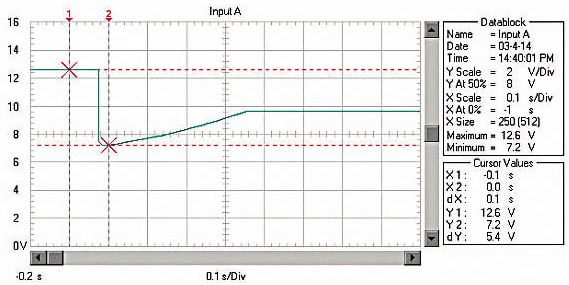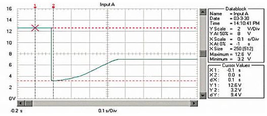 由于RM、RB、RL均非常低,啟動電流非 常大。例如用12V、45Ah的蓄電池啟動安裝1.9升柴油機的汽車,蓄電池的電壓在啟動瞬間由12.6V降到約3.6V!啟動過程的蓄電池電壓波形如圖 1;啟動瞬時的電流達550A,約為蓄電池的12C的放電率!啟動過程的蓄電池電流波形如圖2,(電流傳感器的電流/電壓變換比率:100A/V)。盡管 車用蓄電池是啟動專用蓄電池,可以高倍率放電,但在圖1中可以看出,10倍以上的高倍率放電時的蓄電池性能變得很差,而且,如此高倍率放電對蓄電池的損傷 也是非常明顯的。啟動過程的電壓劇烈變化也是極強的電磁干擾,可以造成電氣設備的“掉電”,迫使電氣設備在發電機啟動過程結束后重新上電,計算機在這個過程中非常容易死機。因此,無論從改善汽車電氣設備的電磁環境還是改善汽車的啟動性能和蓄電池的性能、延長使用壽命來考慮,改善汽車電源在啟動過程的性能是必要的。