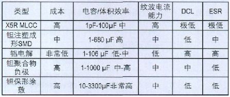 MLCC具有良好的低DCL特性,但在某些情況下,鉭電容能夠以更小的體積提供同樣低的DCL.表5 比較說明了根據DCL要求正確評估和選擇合適的電容的計算方法。如表5所示,鉭電容一般按照DCL最大值來確定規格。標準二氧化錳 (MnO2)構造的鉭電容在生產廠家處是按照 (。01xCV) 進行分級的。某些電容生產廠家還會隨DCL信息提供具體的保壓時間,并且根據比同級別的DCL最大值低得多的具體DCL限值進行電容器的預篩選。