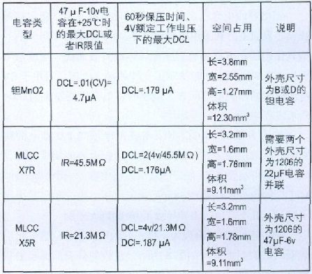 MLCC的額定電壓可以與工作電壓相同或者略高,因此6V的額定電壓已經足夠。對 MLCC 而言,如果已知 IR (見表5)和工作電壓 (4V),可以計算出 DCL.適用于低DCL應用的MLCC有X5R和X7R兩種電介質。根據額定工作電壓,可以根據歐姆定律,用元件的IR值計算出 DCL.
