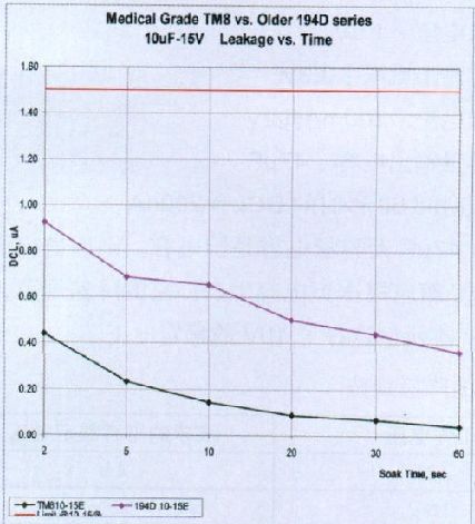 圖8是一種47uF-10V的鉭電容,雖然其最大DCL為4.7uA,根據特定的保壓時間篩選后,可為應用提供超低DCL.以圖8的元件為例,該批量可以按照10秒鐘DCL 600nA的標準篩選,從而把總體 DCL 從 4.7uA 降至 600nA 限值。