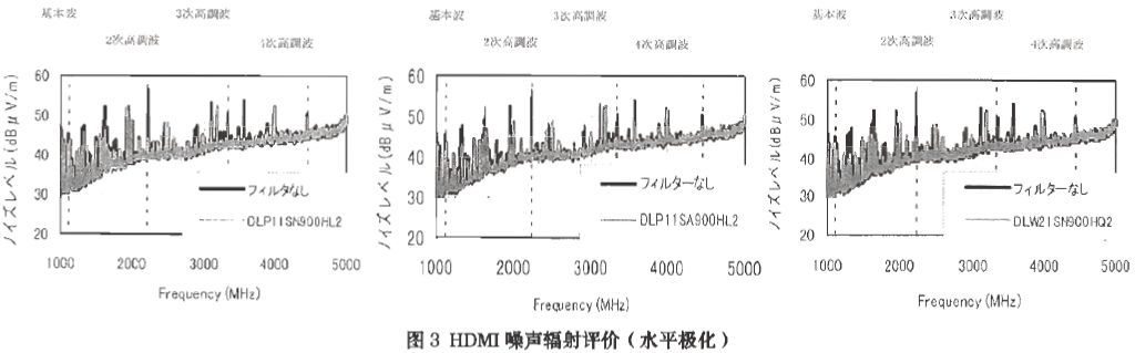 圖3所示為使用共模扼流圈后,HDMI輻射噪音的測量結(jié)果。從圖中可見,這種共模扼流圈圖可以抑制1GHz甚至更高頻率的噪音。實際上,它對高次諧波有很強的抑制效果。所有這些共模扼流圈應用的效果來講,噪音在2.22GHz處衰減約為10db。圖中還顯示出由于使用了共模扼流圈,噪音在3.33GHz和4.44GHz時的衰減呈現(xiàn)多樣性。另外,從圖中可見,DLP11SN900HL2的噪音抑制效果比其它型號共模扼流圈差,這是因為DLP11SN900HL2的Scc21值在3GHz及更高頻率處相對較低,如圖2所示。由圖2和圖3顯示結(jié)果可見,增加一個在30GHz及以上頻率處有10db以上衰減能力的共模扼流圈是必須的。