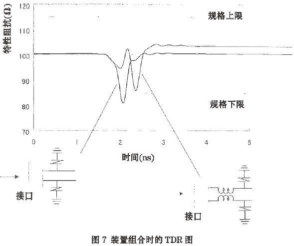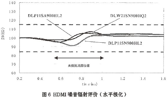 圖6所示的是用一個TDR測量儀器測試共模扼流圈的阻抗。零件的阻抗等于傳輸線的特性阻抗。為了使傳輸信號沒有輻射,阻抗匹配是必須的。圖6同時也顯示了共模扼流圈用于阻抗匹配的評價,符合HDMI標準要求的100+/-15Ω。由于使用了一個ESD器件的電容器,有時會造成阻抗不能滿足標準的需要。在這種情況下,用共模扼流圈加ESD壓敏電阻就可以滿足阻抗匹配標準了。圖7所示為在HDMI接口和1.0PF電容的ESD壓敏電阻之間加一個DLP11SN900HL2的阻抗情況。此時的阻抗已經(jīng)滿足阻抗匹配標準了。
