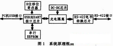 系統原理框圖如圖1所示。USB的一大優點是可以提供500 mA的5 V電源,因此,設計時可以采用總線供電。信號通過FT4232H接口芯片,內部處理后轉換成4路接口信號。4路相同的信號,通過光電隔離后再經過RS422電平轉換芯片轉換為RS422信號。光電隔離芯片是6N137,由于光電隔離左右端電源要求隔離,所以采用DC-DC芯片F0505S-1WR,電平轉換芯片采用的是SP491,8位移位寄存器采用的是SN74HCT595,主要是用來顯示各路的發送接收狀態,而串行EEPROM采用的是93C46B,用來對數據進行一定的存儲。