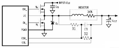 由于輸出電壓低,那么電流比較器的兩個輸入管腳的共模電壓較低,因此可以使用低輸入共模電壓的差動放大器,提高電流檢測的精度,降低噪聲。這種配置另一個大的優(yōu)點是可以使用電感的DCR作為電流檢測電阻。要注意的是,在電感值和飽和電流滿足整個輸入電壓范圍和輸出負載電流范圍的前提下,對電感的DCR有一定的限制,因而在一些應(yīng)用中需要定制電感。此外,電流比較器的輸入阻抗要大,兩個輸入管腳的偏置電流要小,從而提高使用DCR作為電流檢測電阻時的檢測精度。相關(guān)的濾波元件也在設(shè)計作相應(yīng)的匹配,如下圖所示。