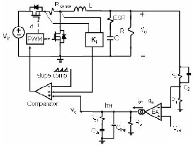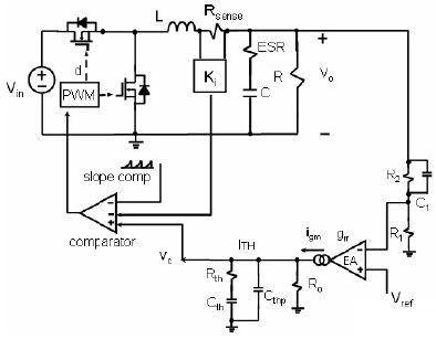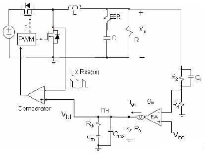 前面的討論知道:在每個開關(guān)周期,續(xù)流回路即低端的開關(guān)管流過的電流波形為下降階段的梯形狀波形。對于這種電流模式常稱為谷點電流模式。和峰值電流模式一樣,谷點電流模式反饋也有二個環(huán)路:一個電壓外環(huán),另一個是電流的內(nèi)環(huán)。其工作原理如下:高端的主開關(guān)管開通,電感激磁,電流線性上升;高端 MOSFET的導(dǎo)通一段固定的時間,此時間由 PWM 設(shè)定。當高端 MOSFET 關(guān)斷后,低端MOSFET 導(dǎo)通,此時電感開始去磁,電流線性下降。注意到低端 MOSFET 的電流隨著時間線性下降,電流檢測電阻的電壓信號也線性下降,由于此時電壓外環(huán)的輸出電壓信號低于電流檢測電阻的電壓,電流比較器輸出為低電平。當電流檢測電阻的電壓信號繼續(xù)下降,直到等于電壓外環(huán)的輸出電壓信號時,電流比較器的輸出翻轉(zhuǎn),從低高電平翻轉(zhuǎn)為高電壓,邏輯控制電路工作,關(guān)斷低端的續(xù)流開關(guān)管的驅(qū)動信號,高端的主開關(guān)管開通,此時電感開始激磁,電流線性上升,進入下一個周期,如此反復(fù)。
