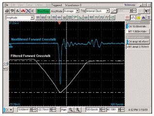 藍色波形是由白色波形濾波后減緩了脈沖上升沿得到的波形,它代表的就是對串擾進行后濾波的結果。圖中顯示的紅色和藍色兩個串擾波形是以相同的電壓刻度顯示的。