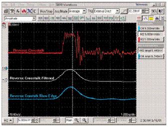由于測量時來自80E04的輸入階躍電壓具有非常快的邊沿,因而得到的串擾過大,并不能代表實際邏輯電路中的驅動信號。例如,如果驅動信號來自一個1.5 ns的CMOS門,產生的串擾脈沖就更寬,幅度也更小。要使測量能夠體現出這種情況,可利用儀器的定義算法(Define Math)功能在信號捕獲之后增加一個低通濾波器。圖7中的M1波形(白色)給出的就是經濾波后的測量結果。需要注意的是M1在垂直方向比未經濾波的波形敏感10倍。