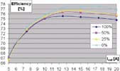 - 在600kHz,12.5A條件下, 漏極電感的50%比0%的效率將減少8.5%。由于MOSFET溫度過高,12.5A以上便無法進行試驗。