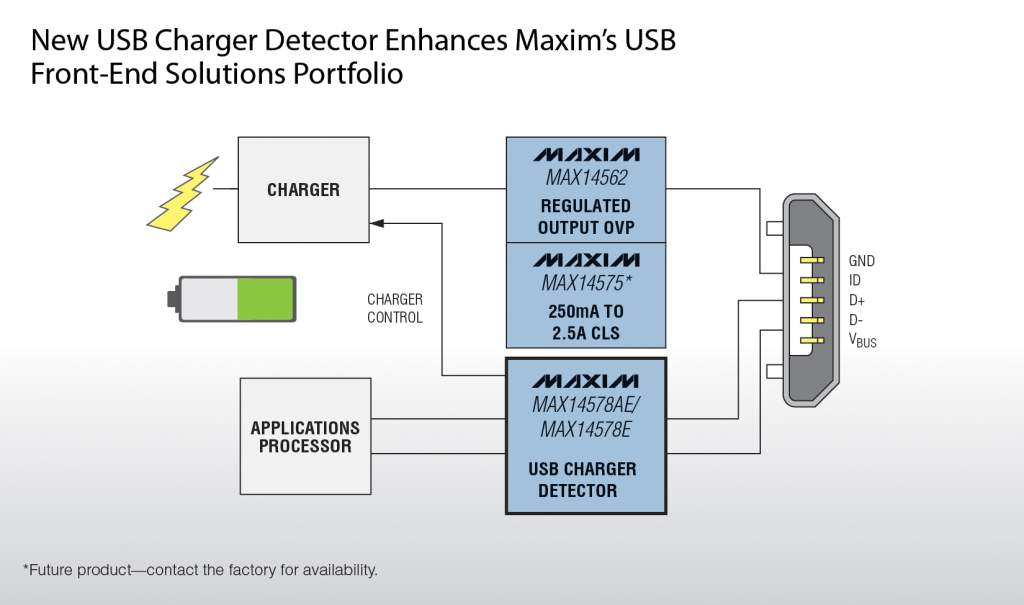 Maxim Integrated Products, Inc 于近日推出業內尺寸最小、符合USB電池充電規范的USB電池充電檢測器MAX14578E/MAX14578AE。除了可以檢測Apple和Sony專有充電器適配器外,該系列器件還可以檢測USB標準下行端口(SDP)、USB充電下行端口(CDP)或專用充電器端口(DCP)。一旦檢測到充電端口,MAX14578E/MAX14578AE將控制外部鋰離子(Li+)電池充電控制器,以優化充電時間和充電效率。
