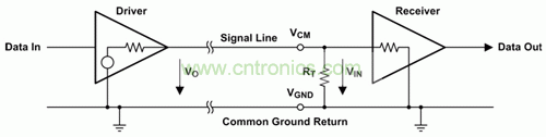 單端數(shù)據(jù)傳輸僅使用一條信號線,其電勢被看作接地。當信號線為信號電流提供正向通道時,接地線會提供回流通道。圖 1 顯示了單端傳輸通道的基本示意圖。