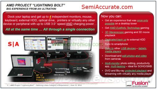 Lightning Bolt由三部分組成,分別是線纜、特殊的底座及筆記本之類的終端,聽起來很復雜,但其實Lightning Bolt使用的也是標準的DP接口,理論上甚至能支持雷電接口。雖然只有一條DP通道,但是用它就可以連接Eyefinity多屏輸出以及5個USB 3.0接口,這也是Lightning Bolt接口在平板及超級本這樣缺少空間提供又大量接口的設備上存在的意義。