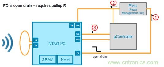 為了省電,整個系統可以通過FD 引腳檢測到有外部場強時喚醒主控,FD腳拉低喚醒: