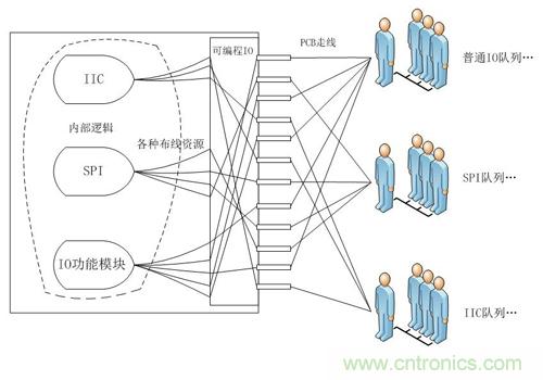 實際FPGA內部并不像圖2那么簡單,這里只是為了形象說明可編程IO可以使內部邏輯和PCB可以相對獨立設計。對于同類接口,不必因為PCB改變而更改時序邏輯,只需要更改引腳分配,大大簡化了PCB的布線難度。