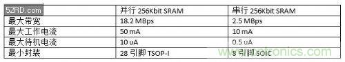 所有這些發(fā)展趨勢(shì)都指向一個(gè)要求:一個(gè)小巧、能夠只扮演緩存的角色、并能使用最小數(shù)量的引腳相連的外置SRAM。串行SRAM就是專(zhuān)為滿(mǎn)足這個(gè)要求而量身定做的。存儲(chǔ)器在高速性能并非最重要因素的其它存儲(chǔ)器(DRAM、閃存等)中,串行接口已經(jīng)取代了并行接口。由于存在需要SRAM的應(yīng)用,串行SRAM在SRAM市場(chǎng)中一直處于小眾地位。在空間非常有限的特定應(yīng)用中,它們一直是低功耗、小尺寸替代方案。目前,在峰值時(shí)鐘速率為20MHz(10MB/s帶寬)條件下,串行SRAM最大容量為1Mbit。相比之下,并行SRAM的帶寬高達(dá)250MB/s,并支持最大64Mbit的容量。下表對(duì)比了一個(gè)通用型256Kbit并行SRAM和一個(gè)256Kbit串行SRAM。