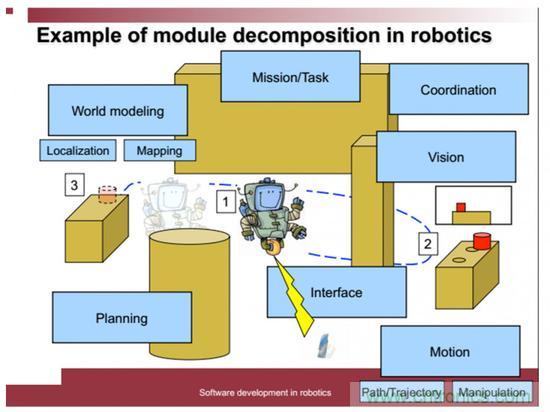 從人類第一臺可編程的機器人開發伊始,架構問題就與之相伴而生。早在1996年,Garlan和Shaw在《軟件架構:一門新興學科的展望》就總結了移動機器人的基本設計需求, 如:(1) 慎思規劃和反應式行為;(2)容許不確定性;(3)考慮危險;(4)靈活性強。針對這些要求,他們評估了四種用于移動機器人的架構,包括控制回路(control loop)、分層(layers)、隱式調用(implicit invocation)、黑板(blackboard)。經過了幾十年的實踐,一些架構被逐漸淘汰,一些架構逐漸被完善起來。