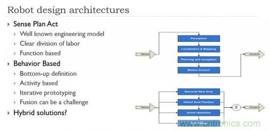 沒有萬靈的結構,混合系統結合了SPA和反應體系的原理,將多種混合系統應用于在傳感器和電機輸出間進行協調來完成任務?;旌辖Y構相結合最具吸引力的好處可能是:系統按照有利于完成任務的標準進行設計,而非刻板的遵循某一教條。但再復雜的機構,基本上也都是二者的組合。以ROS的導航包為例: